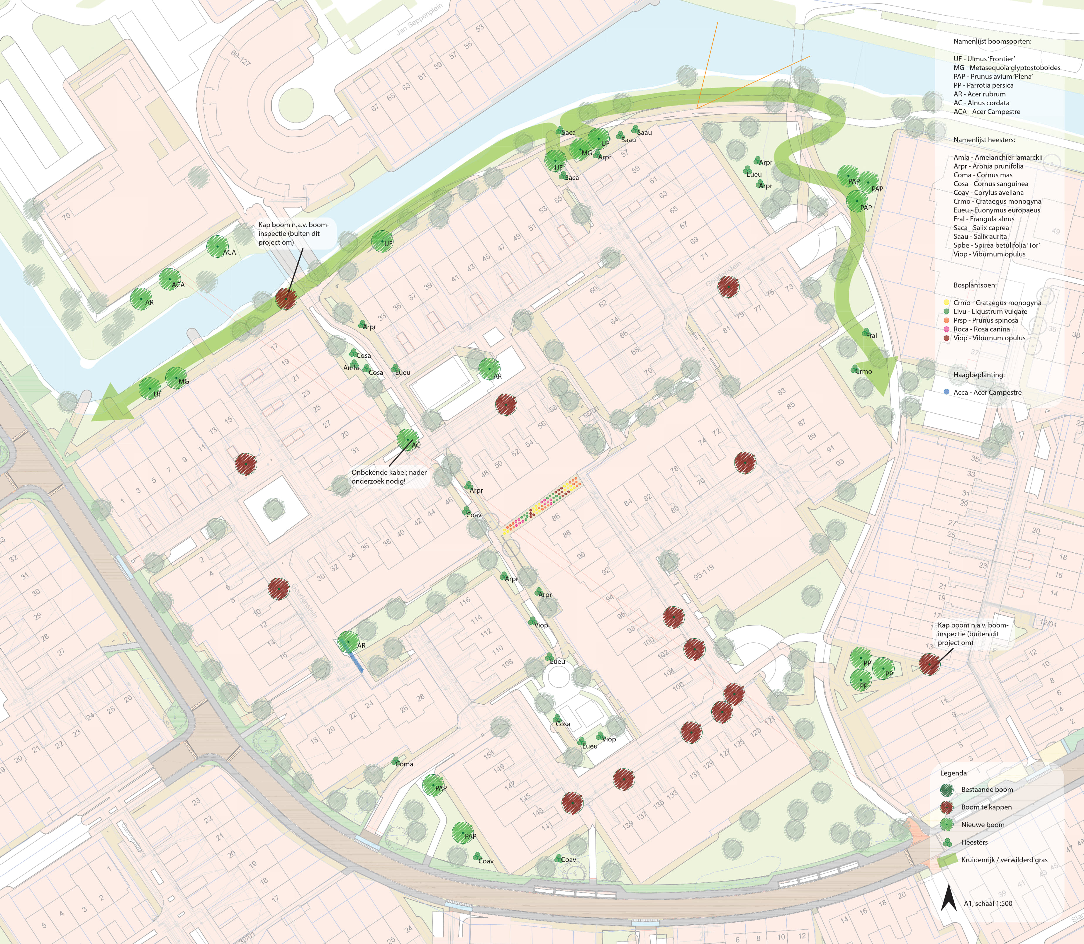- Er zijn 12 bomen gekapt. Samen met een werkgroep is een plan gemaakt om groen terug te brengen in de straat.